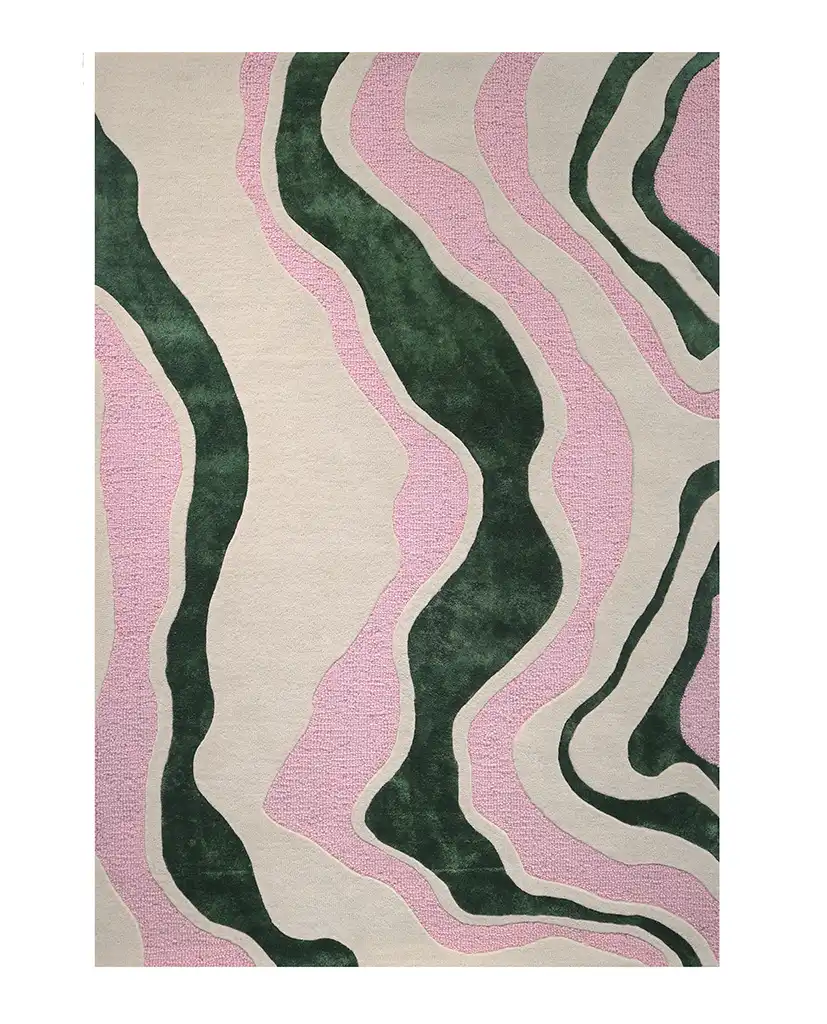 Tämä Virta-matto on suunnitteluprosessin aikana valmistettu uniikki mallikappale. Matossa on erityinen väriversio, joka ei päätynyt lopulliseen mallistoon: matossa on luonnovalkoista ja kirkkaan pinkkiä villaa yhdistettynä tummanvihreään tenceliin. Tätä värivaihtoehtoa on saatavilla vain yksi kappale.